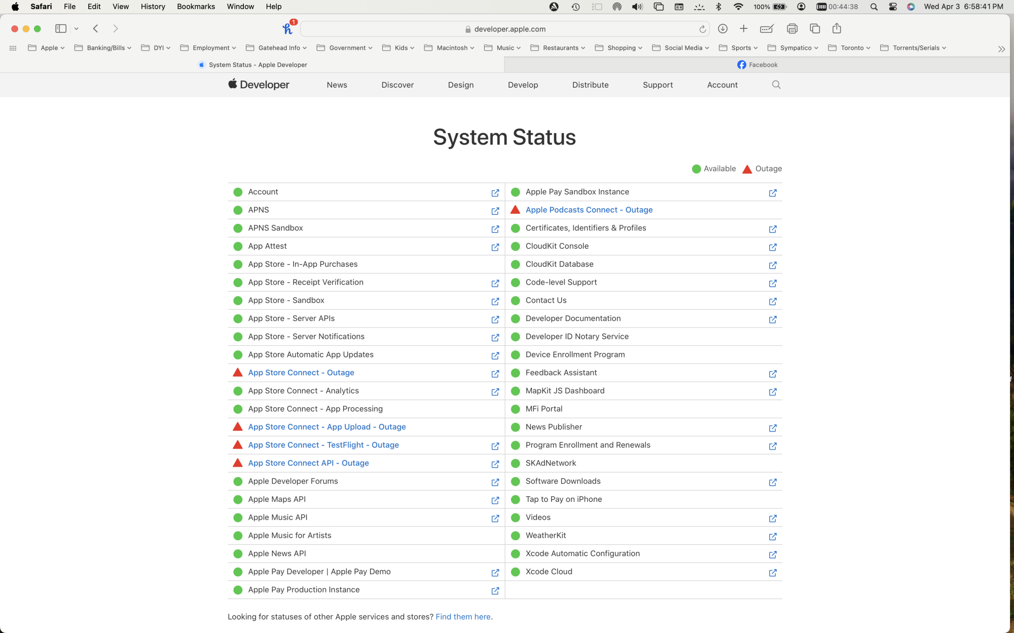 The full list of services experiencing outages for many customers, according to Apple's system status page: