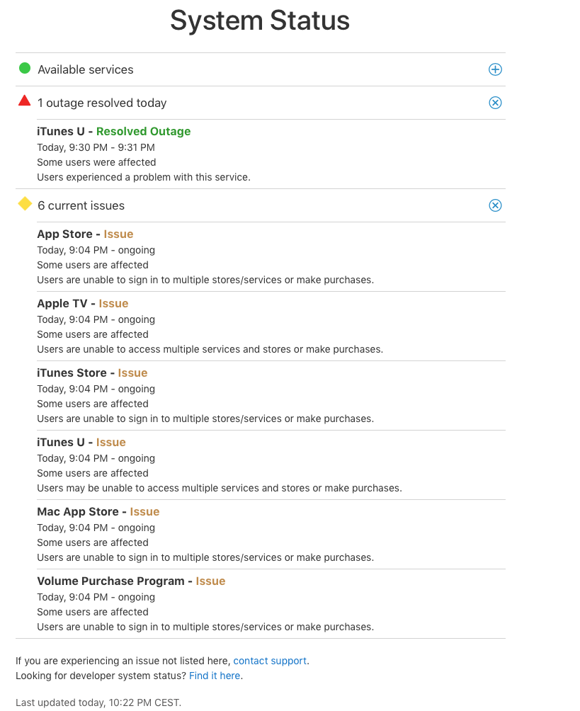 Update: Apple's System Status page now displays issues with the App Store, Apple TV, iTunes U, iTunes Store, Volume Purchase Program, and Mac App Store.
