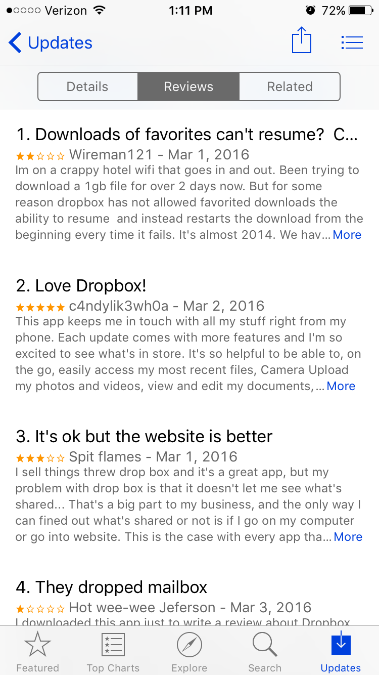 Seems like those with a lot or with a few reviews are the same. Here's an example of the first few reviews for the current version of Dropbox (for which there are 31 reviews so far), as you can see it goes from March 1st to 2nd back to 1st and then 3rd.View attachment 619830