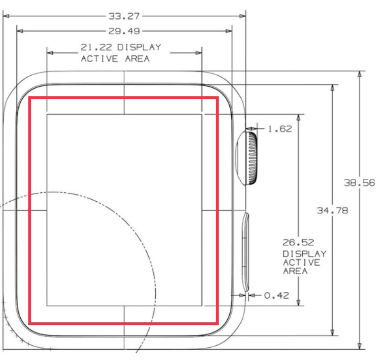 Additionally, there is a leak that did not address rounded corners, but which pegged the screen size at 1.57” (39.9mm). If you believe that rumor, a little math says the screen dimensions would be about 30.73mm (H) x 25.45mm (W) with approx a 2mm bezel inside the 34.78 x 29.49 watch face.