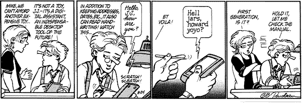 For the younger set here with no memory of the Newton, its poor handwriting recognition (especially in the first version) was mocked for weeks by the popular Doonesbury comic, helping to publicly doom it with strips like this one: