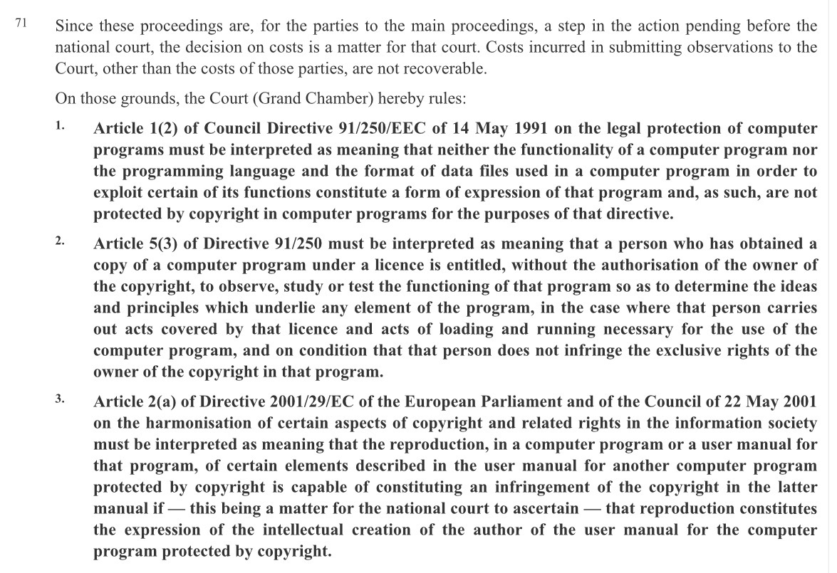 - In short, the ruling you cited only allowed replication of functionality, not reuse of the original software or its components. Apple’s SDKs, APIs, and tools contain Apple owned code and expression that the developers' iOS apps use directly. That’s not "reverse engineering" or "functional emulation" it’s active use of Apple’s IP, and under EU law I cited above, that requires a license.