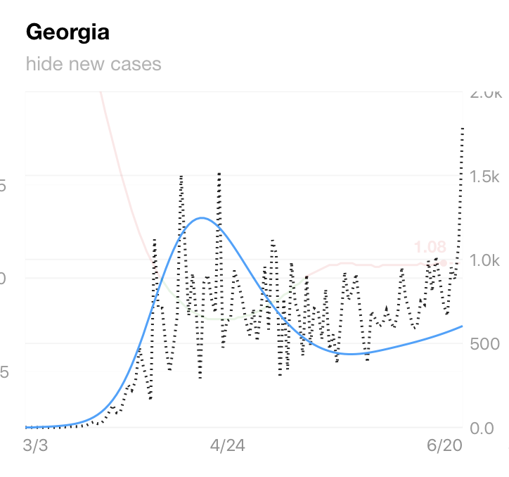 The fact is Georgia doesn’t have a massive spike, but it’s no victory for anyone. Cases are trending up again, with a shallow exponential curve, and political will to fight it is trending downwards. Mobility data shows Georgians on the move again, but not using public transport. Maybe the population will beat the spread with their own voluntary piecemeal decisions to distance, which is I guess the American way, but if so that would be a validation of what some people call the ‘fearmongering’, because if people weren’t concerned they wouldn’t do anything.
