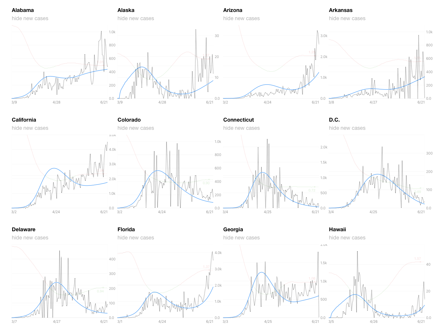 You can see all 50 states and the more interesting Rt numbers at rt.live