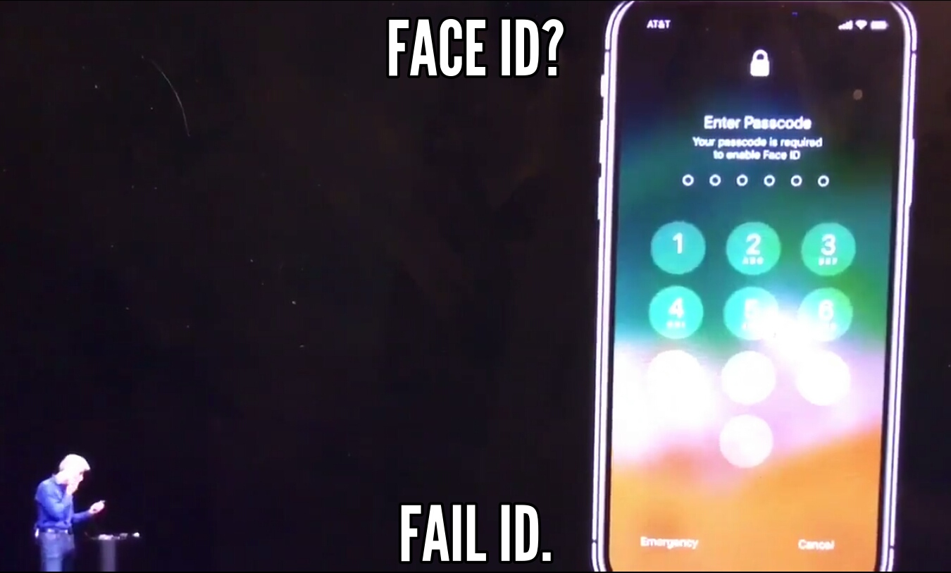 That first demo of Face ID on stage with Craig was a total bummer. "Here, let's show you just how easy it is to use Face ID...errr, let's go to plan B and enter the passcode." (My paraphrase)