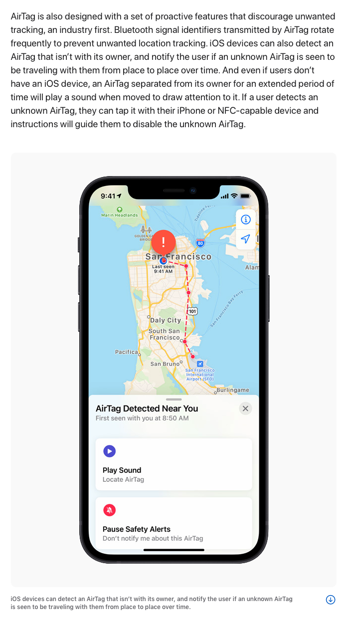 "AirTag is designed to discourage unwanted tracking. If someone else’s AirTag finds its way into your stuff, your iPhone will notice it’s travelling with you and send you an alert. After a while, if you still haven’t found it, the AirTag will start playing a sound to let you know it’s there."