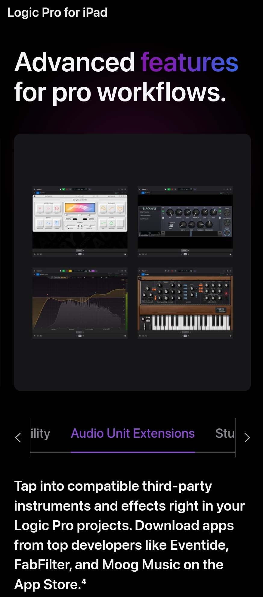 Small print at the bottom (note 4): Requires compatible third-party Audio Unit Extensions from the App StorePlug ins are supported. Not sure to what extent, but they are available.