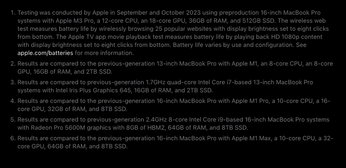 Testing conducted by Apple in September and October 2023 using pre‑production 16‑inch MacBook Pro systems with Apple M3 Max, 16‑core CPU, 40‑core GPU and 128GB of RAM, production 16‑inch MacBook Pro systems with Apple M2 Max, 12‑core CPU, 38‑core GPU and 96GB of RAM, production 16‑inch MacBook Pro systems with Apple M1 Max, 10‑core CPU, 32‑core GPU and 64GB of RAM, and production 2.4GHz 8‑core Intel Core i9–based 16‑inch MacBook Pro systems with Radeon Pro 5600M graphics with 8GB of HBM2 and 64GB of RAM, all configured with 8TB SSD. Redshift v3.5.18 tested using a 29.2MB scene utilising hardware‑accelerated ray tracing on M3‑based systems, and software‑based ray tracing on all other units. Performance tests are conducted using specific computer systems and reflect the approximate performance of MacBook Pro.