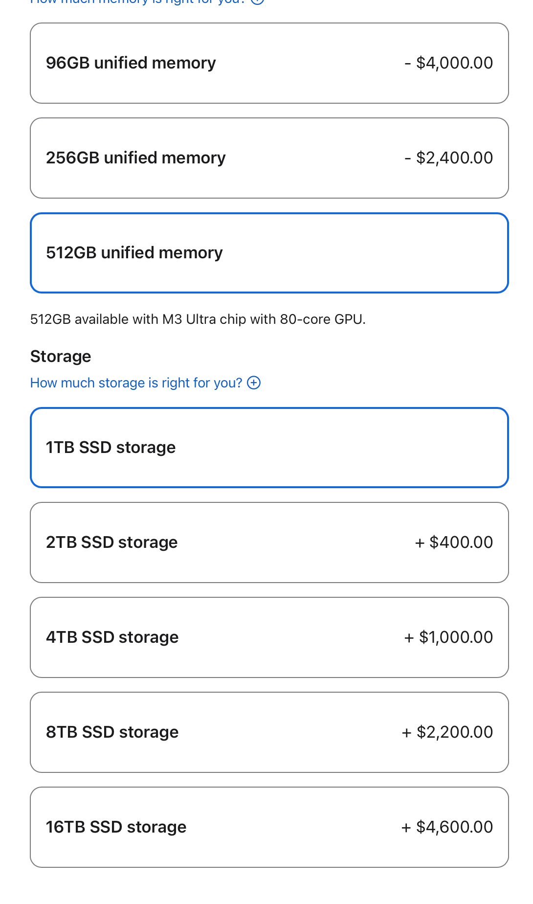 In addition, the Mac Studio can now be configured with up to 16TB of SSD storage, up from the previous model's 8TB maximum. And the M3 Ultra chip supports up to 512GB of unified RAM, whereas the M2 Ultra maxed out at 192GB of unified RAM.