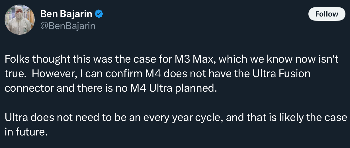 Unless it comes from Apple directly, I won’t believe it. People were very strong with their opinions that the M3 Max was missing this too. Even showed evidence with the chip design.It doesn’t look like it per Ben Bajarin, a chip industry consultant who also has a good podcast on the chip industry. He says the Ultra will skip a generation so the next one will be the M5 Ultra.