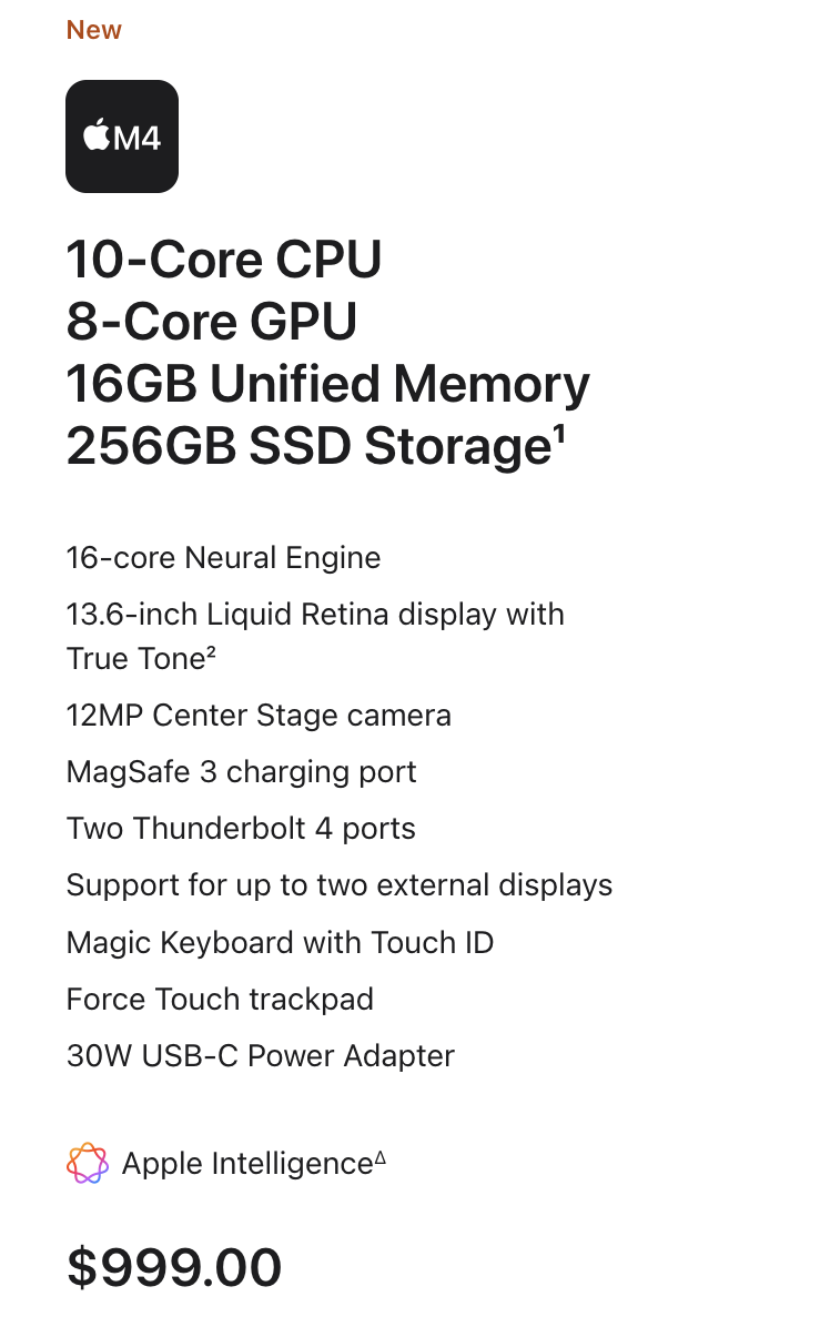 New color is great, no longer RAM-anemic base model, M4, and starting at $999? Somebody pinch me…