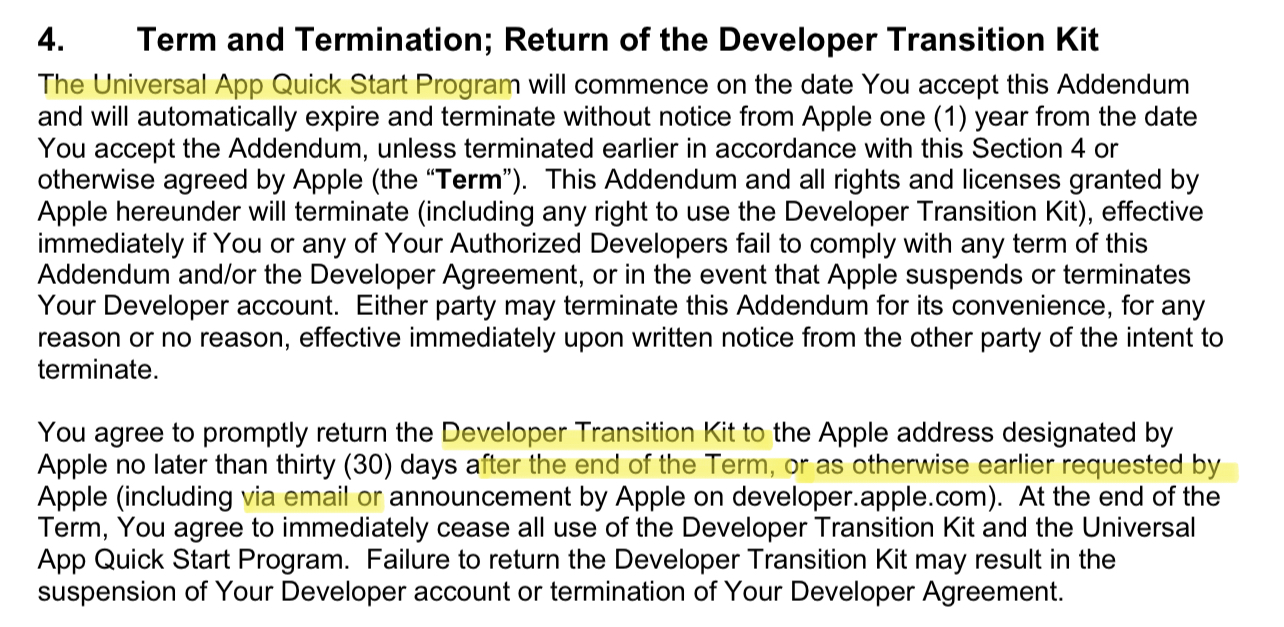 - or when Apple requests you return it earlier than the end of the term (they offer two examples of how such a request can be made, email or dev page)