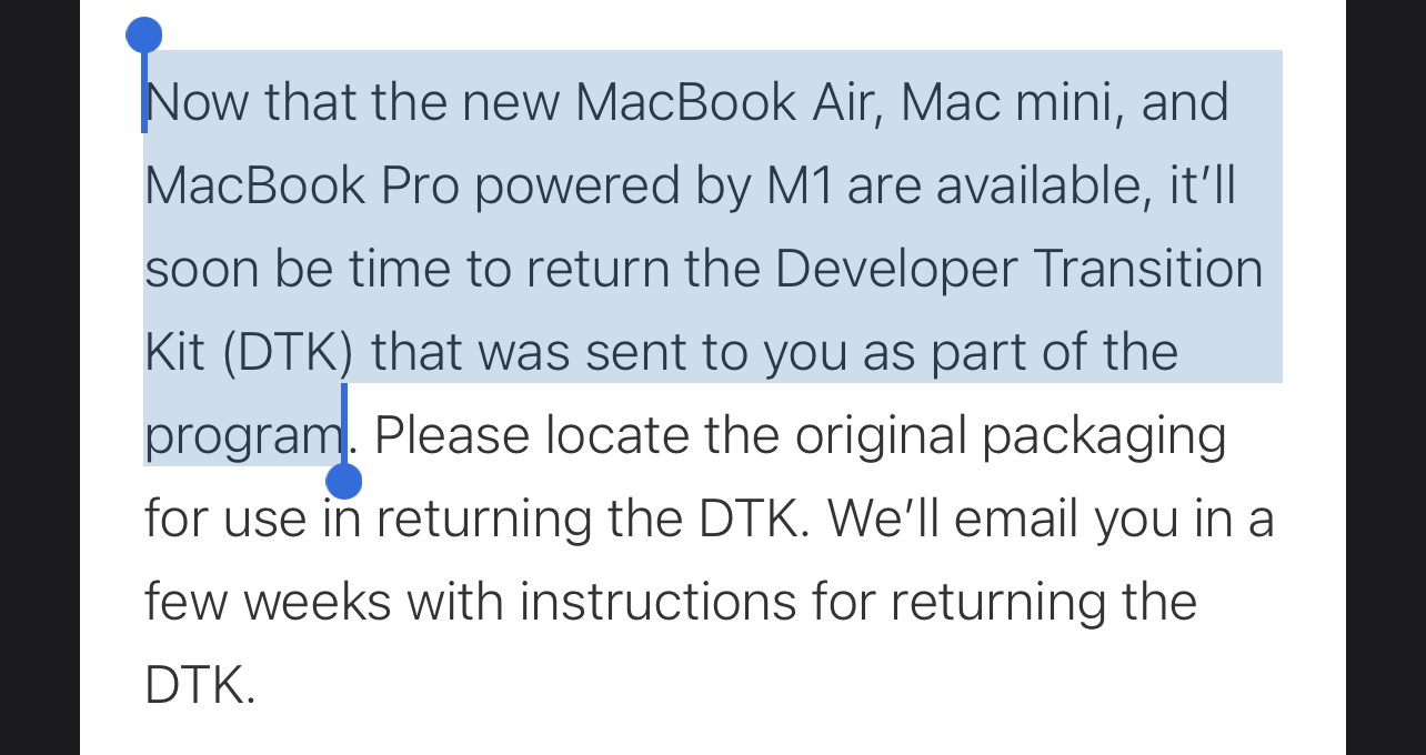 TL;DR: The good news is that the program isn’t terminated and will go on for a year, the bad news is you still have to return the DTK when Apple sends you instructions in a few weeks because the DTK is not the program.