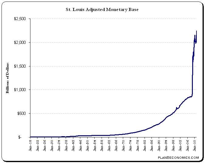 The increase in the M0, as indicated by the graph, shows a dramatic growth during the period from January, 2007 to January, 2010, much of it due to Fed actions aimed at stimulating the economy. Nonetheless, inflation (CPI-U) during that same period averaged 2.35% per year, hardly any cause for concern. At one time, particularly during the years between the world wars, the monetarist school of economic posited a direct relationship between the money supply and prices. Empirical evidence has shown, however, that increasing the M0 has little effect on prices, or inflation. Technically, the fallacy is a failure to fully understand what affects velocity, but in practical terms it means that consumers holding on to their cash, depositing it in banks and other M0 components, are reducing spending. Inflation is a function of supply and demand, and when an economy is in recession, there is little demand. Increasing the M0 will not persuade a consumer whose house and investments have lost value, who is newly adverse to incurring debt, and who is worried sick about losing his job to go on a spending spree.