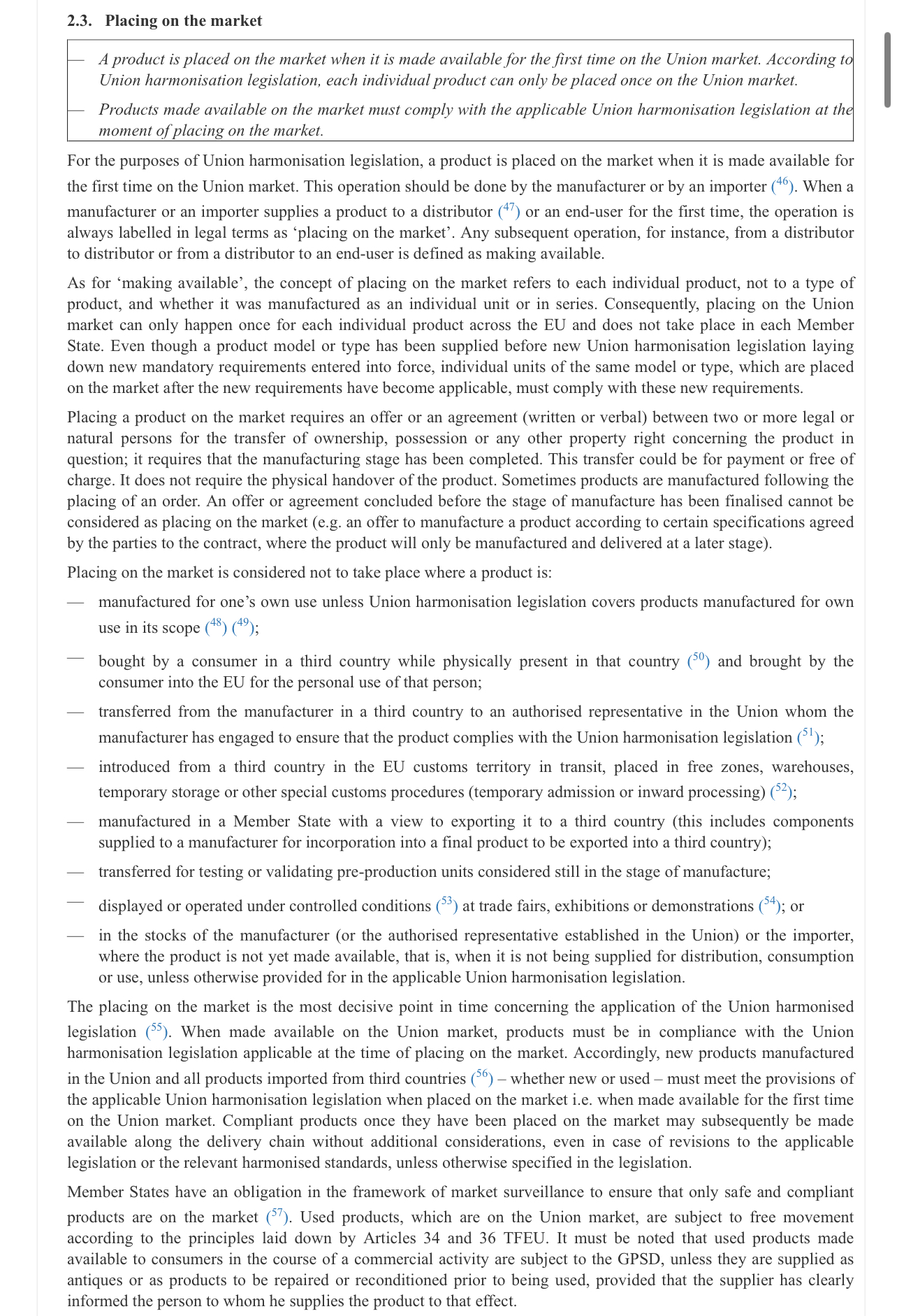 Definition of Placing on the Market (Blue Guide & EU Regulations): You can read the below paragraphs, or even the GPSR (EU) 2023/988