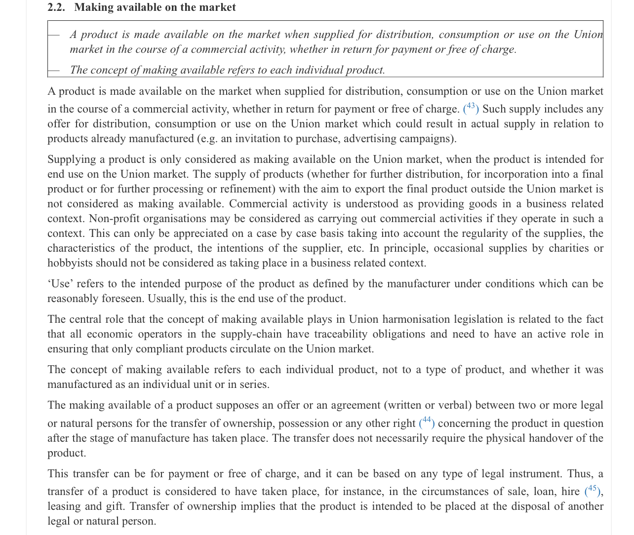 - A product is made available on the market when supplied for distribution, consumption or use on the Union market in the course of a commercial activity, whether in return for payment or free of charge.