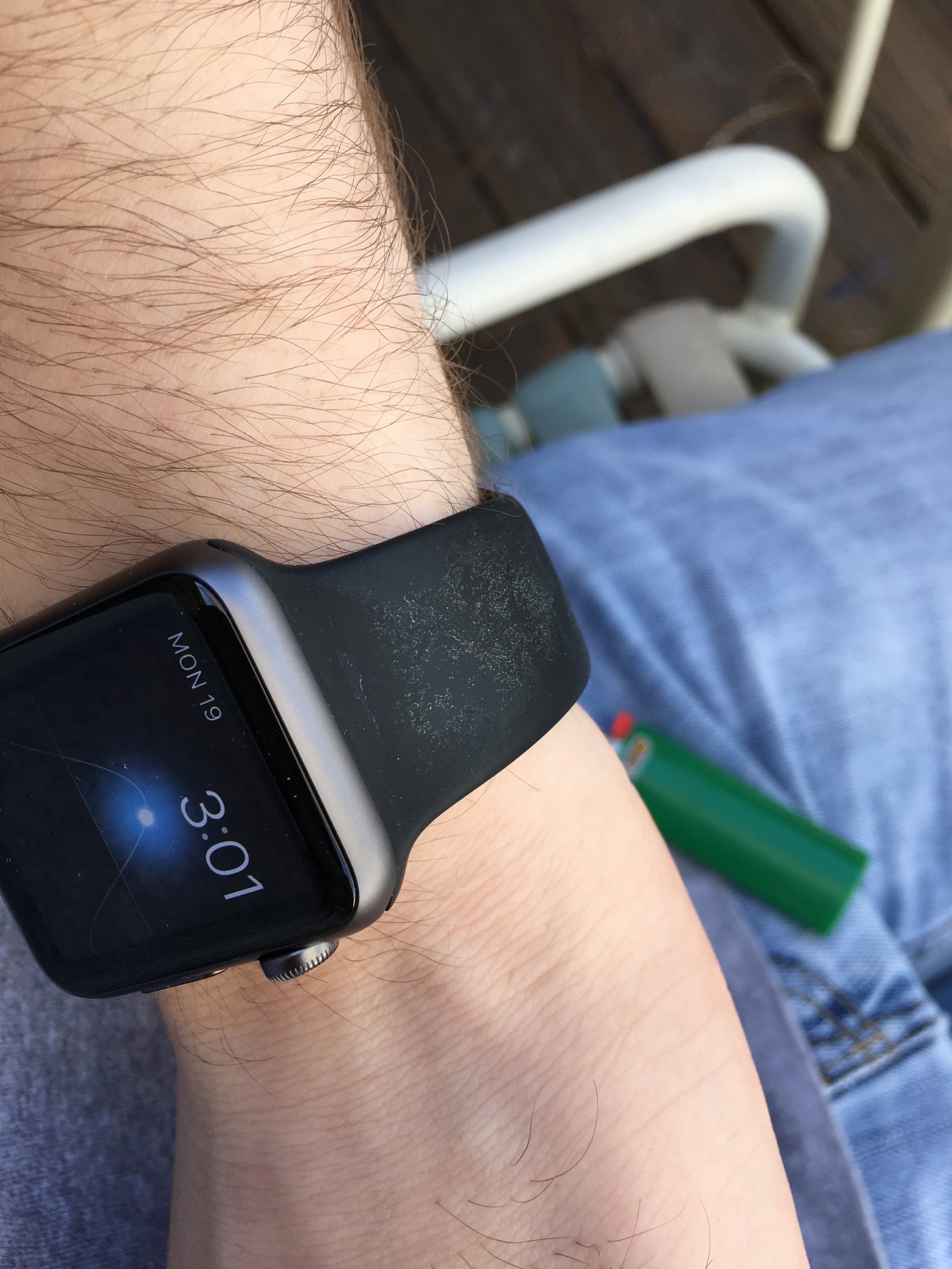 So I've noticed that on my Apple Watch black sports band that it came with the band is peeling on the topside with the peg on it. It started slowly within 2 weeks of having the watch. It's gotten progressively worse, when I get a bit of water on my finger and rub it it seems to get back to the normal color but it will be really dry and flaky lookin in the AM after sitting for charging. Anyone else have this issue?
