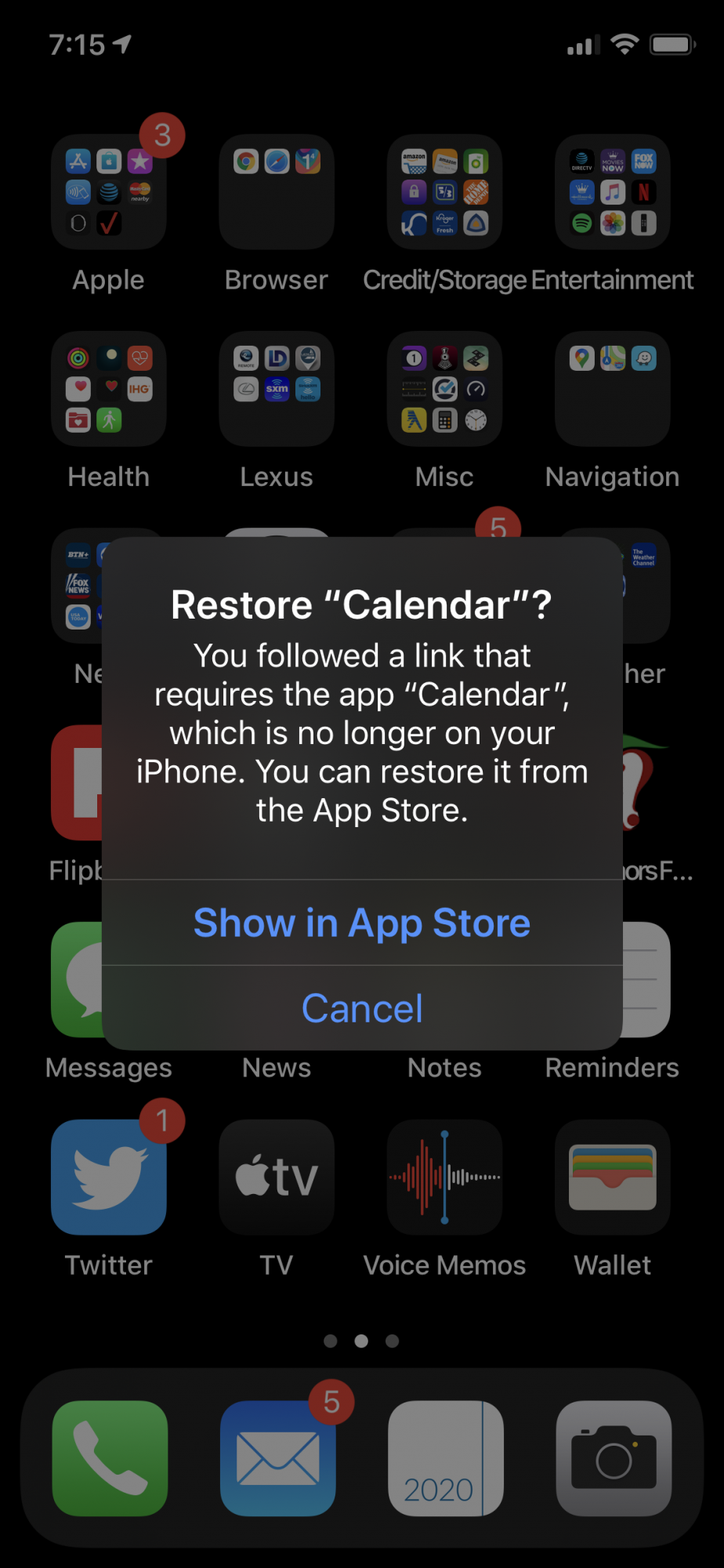 I deleted the Apple Calendar App since I am using Cal 366 and Fantastical