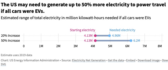 Also, don't forget that producing 1 litre of fossil fuel requires 1,58 kWh of energy. Driving a fossil fuelled car for 100km and consuming 7 litres, will require 11kWh. That's enough for an EV to drive up to 80km. As a consequence, a million more electric cars on the roads will only require 3,6% more electricity.