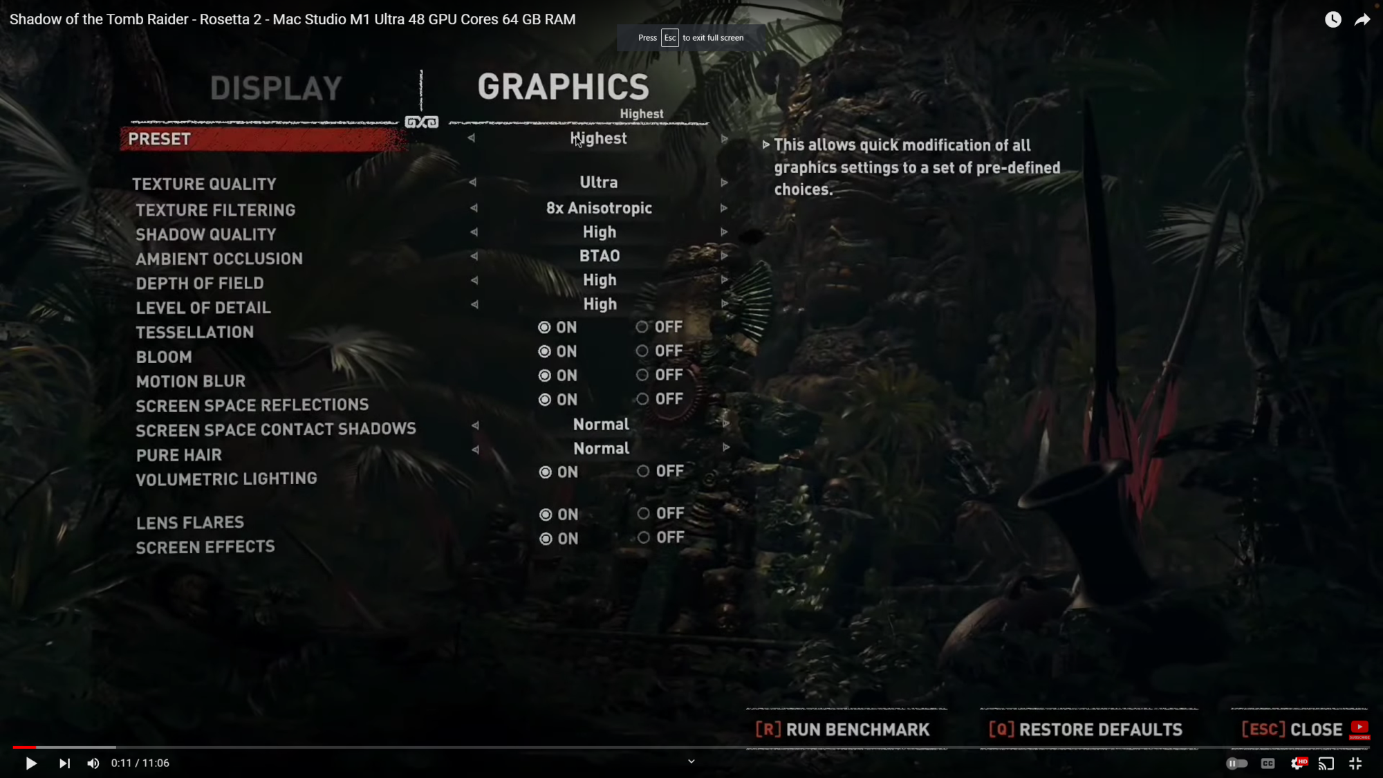 That was when it was running on OpenGL, before the Metal backend update. Frame rates have increased massively since then, especially on AMD. I'll get some benchmarks on my intel MacBook Pro when I get time to re-install windows. I deleted it a while back.Regarding the original discussion about Tomb Raider in MacOS vs Win on the same HW and AMD GPUs I found two other videos. The first one is TR 2013 on iMac with Nvidia GTX 775M, not AMD. No settings shown.