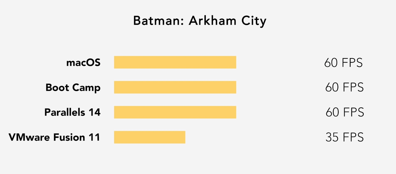 Another game mentioned with a good Mac port compared to Win was Batman: Arkham City which gets the same 60 fps in both MacOS and Win on a MBP Radeon Pro 560X VSYNC Off. Make what you want of it.