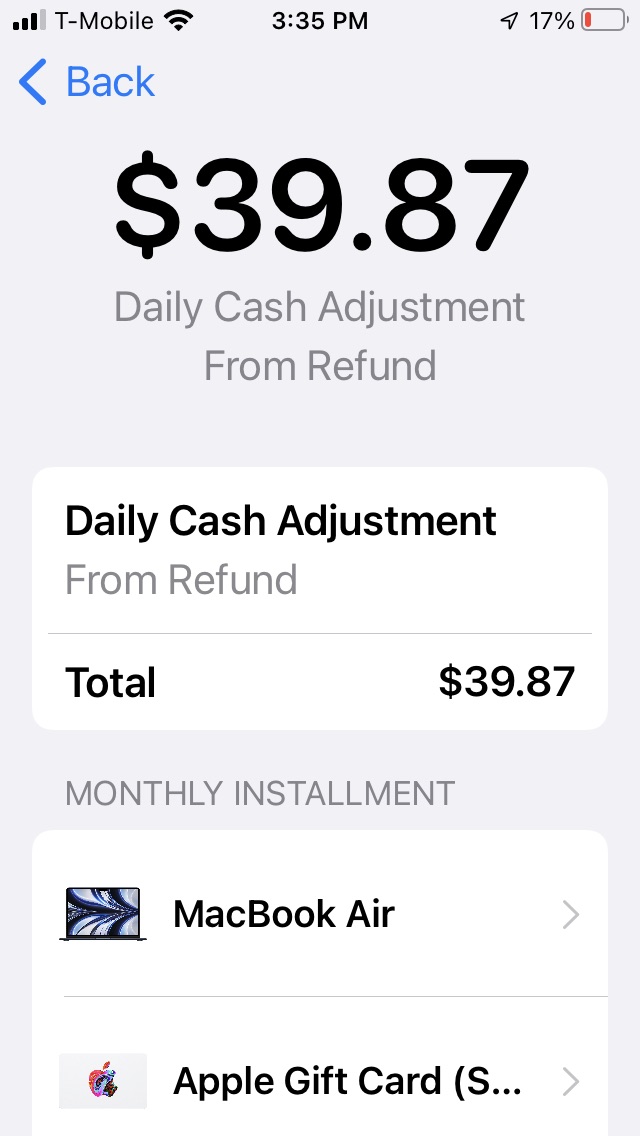 - when a return is made, the corresponding cash reward shows as a new charge on the card. So if you earn a $5 cash reward on an item and then return that item...the $5 reward goes to the separate cash reward card in your wallet, and a new charge of $5 shows up on your card. It should just be a $5 reward on your Apple Card followed by a -$5 offset.