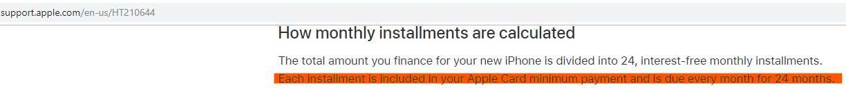 When using Monthly Installments, the cost of your new iPhone is divided into 24, interest-free monthly installments. Each installment is included in your Apple Card minimum payment and is due every month for 24 months. Monthly Installments are billed to your Apple Card statement on the last day of the month.