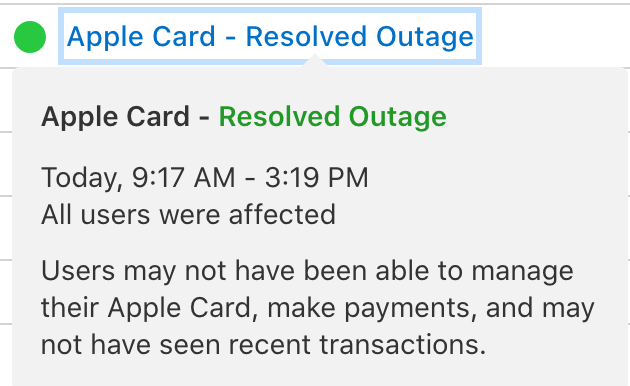 Are there other cards that provide a service that shows up to the minute transaction details? I would imagine they have similar type outages, but they’re not named Apple, soooooo far less clickworthy.Does this happen with other cards, too? I don’t think I’ve ever experienced anything like this on my credit cards. I don’t have the Apple one.