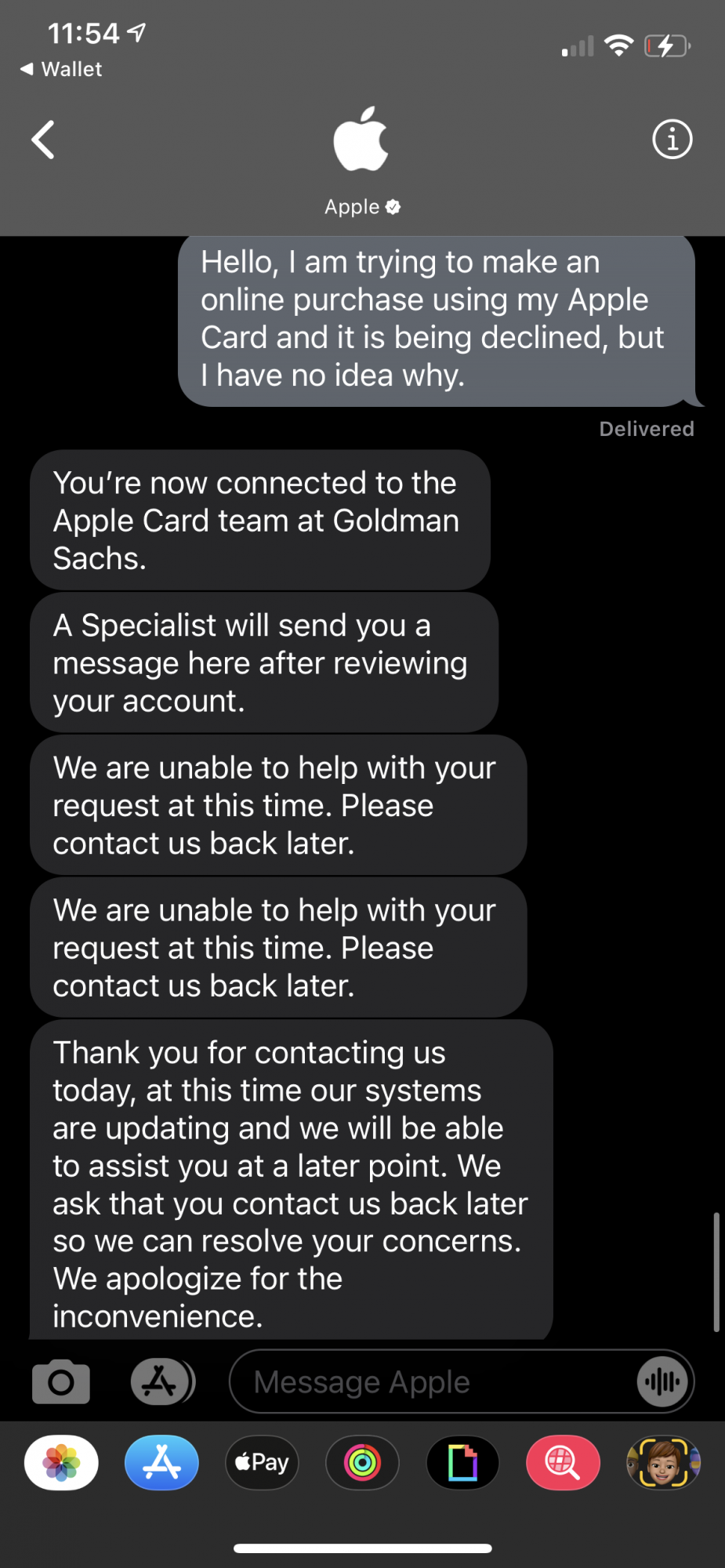 Not sure what you mean… service was great today! 😂Apple Card has to be the worst implementation of a service by Apple ever. The biggest mistake, in my opinion, was partnering with Goldman Sachs, who have never before had a credit card operation. Dealing with GS has been the worst customer service I have ever experienced.