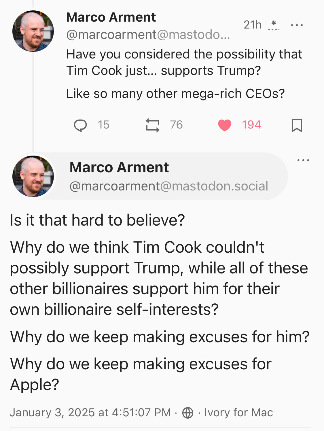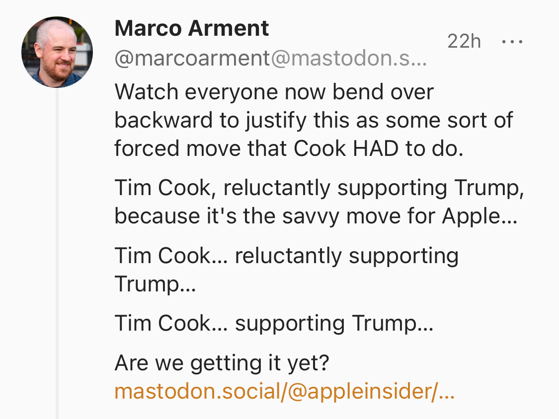This really stinks. It’s making me consider not buying any Apple products until Tim is succeeded. I don’t care whether it’s not Apple. He’s top dog. Why would he financially support a bigot and a criminal? As someone said earlier, Biden didn’t get this. This is the new politics of America I guess.