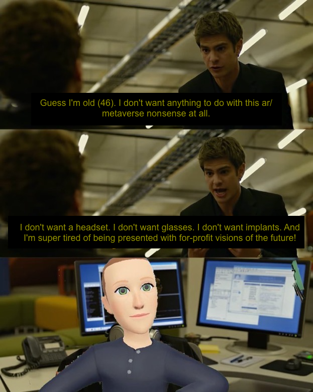 I recommend looking at the twitter account @PessimistsArc.Guess I'm old (46). I don't want anything to do with this ar/metaverse nonsense at all. I don't want a headset. I don't want glasses. I don't want implants. And I'm super tired of being presented with for-profit visions of the future.