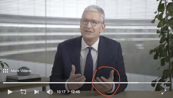 If you focus around the movement of Tim's hand movements and especially his thumbs during the video, it seems as if he is constantly changing posture and at any point that his hands are still and separated for a few seconds there is an apparent tremble visible. I take it a man of his position wouldn't get nervous to give these kind of speeches especially given how passionate he is on the topic. What's odd to me is that I couldn't find any higher resolution versions of this video when apple are known for their high quality video, even when it is an excerpt from a live stream they often release a version recorded with a higher-res camera for release purposes.