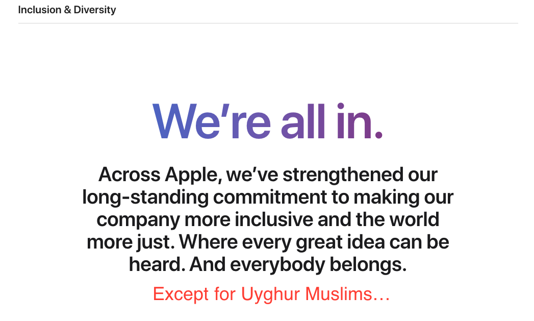When it comes to business, Apple (and apparently most other big businesses globally) will look the other way. So long as there is profit and a business case, however short term the gains are, they will look the other way. China is hostile, and has no benign intentions.This is craziness. I don’t think Apple should be investing so heavily in the Chinese economy given their track record on human rights and the environment.