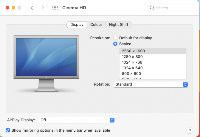 I have a MacMini M1 connected to the 30" Apple Cinema Display (Old one with FW ports) using the Apple Dual Link DVI Mini Display Port Adapter to the Club USB C adaptor. I can access the 2560x1600 resolution using the Option key but I actually want either the 2048x1280 or 1920x1200 options. I can't seem to access these using Option and SwitchResX still isn't functional enough for the M1s. Has anyone had any luck with a 3rd party fix or a terminal trick?