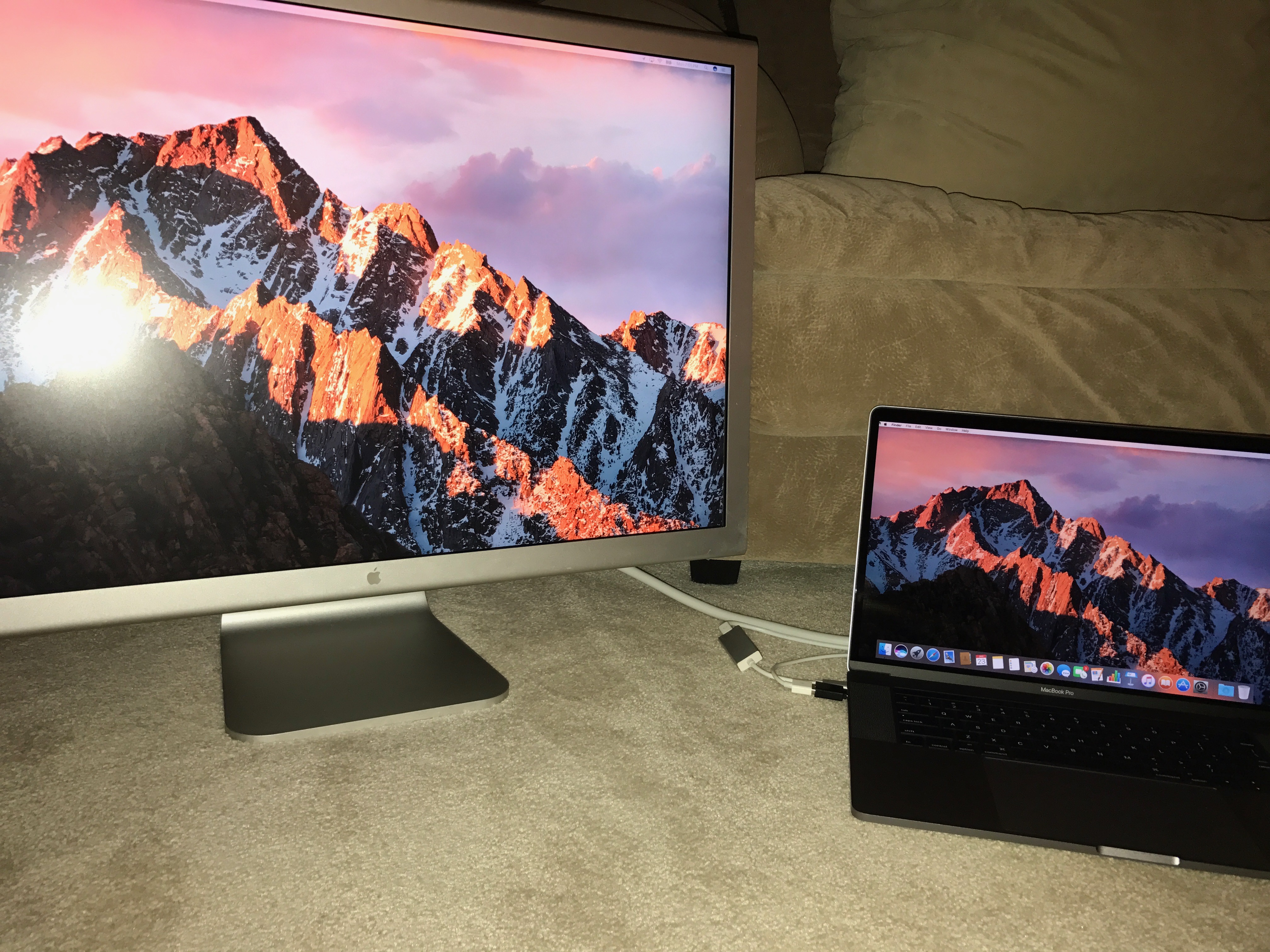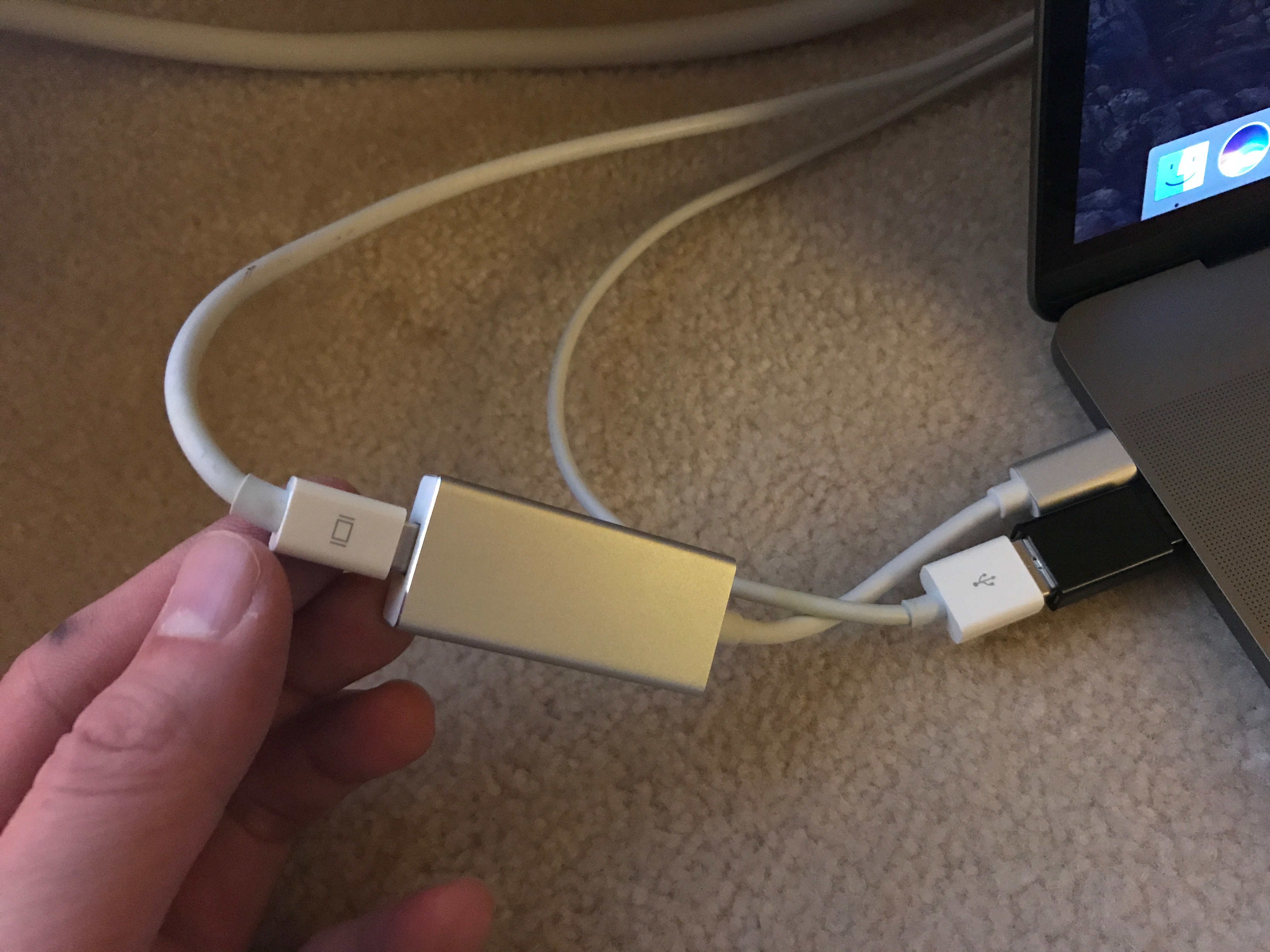 I know some people couldn't get this setup to work and my guess is that either it's the miniDP adapter and I just lucked out that the generic one I got was the right spec or perhaps the USB-C to USB-A adapter is not allowing enough power to be supplied to drive the monitor. I somewhat suspect the latter is true because I've been reading reports from other people that a similar setup worked for them, but then someone else will order the exact same Mini DisplayPort to USB-C adapter and it won't work for the 30" mini-DP display.