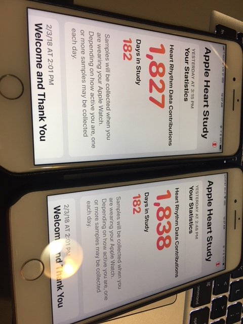 My backups are encrypted so maybe that is why I was able to restore the Apple study to all the phones. Screencap shows my 7+ and 8+ with the app showing the current stats and start date. The stats are just a bit different because I wore the watch with my 8+ today so they haven't quite synced up yet to show the same stats.