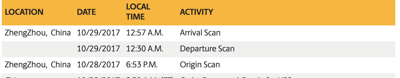 Same for meFor me UPS only shows 10/29 ZZ arrival scan 12:57am and hasn't updated since then. Anyone else have this?