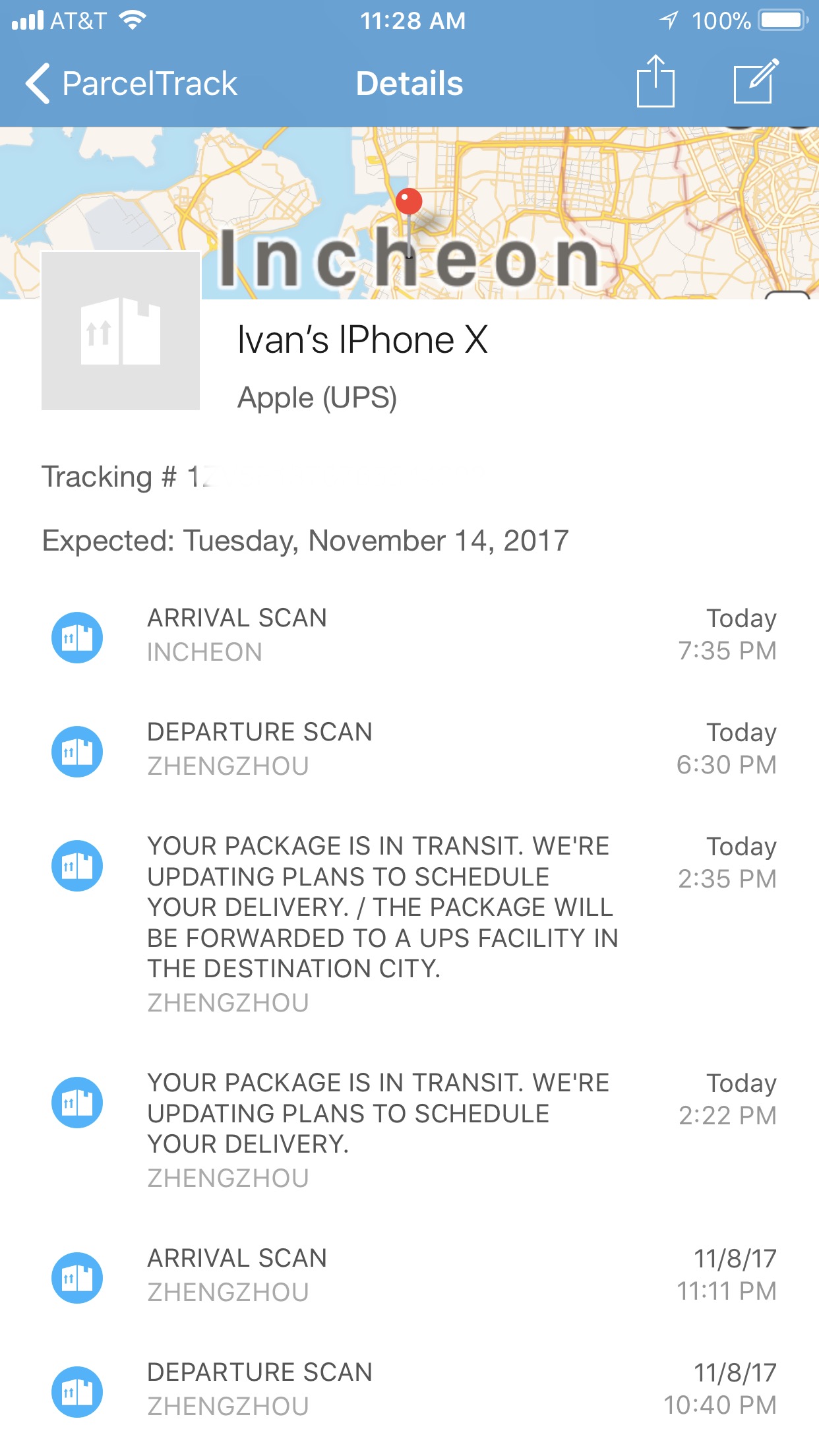 Go with ups tracking. That is probably more accurate.Mine now says the same thing. In 11/17-11/24 shipment group, and although it says "Shipment in transit - delayed" on the Apple.com site with a "Delivers November 20, 2017", UPS tracking says :