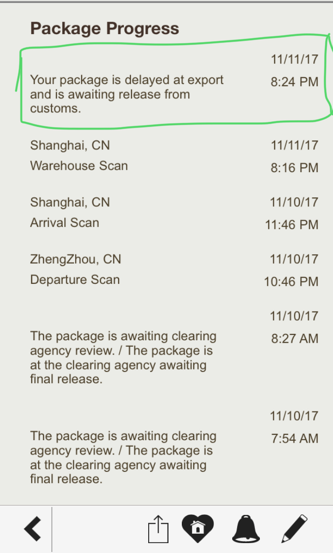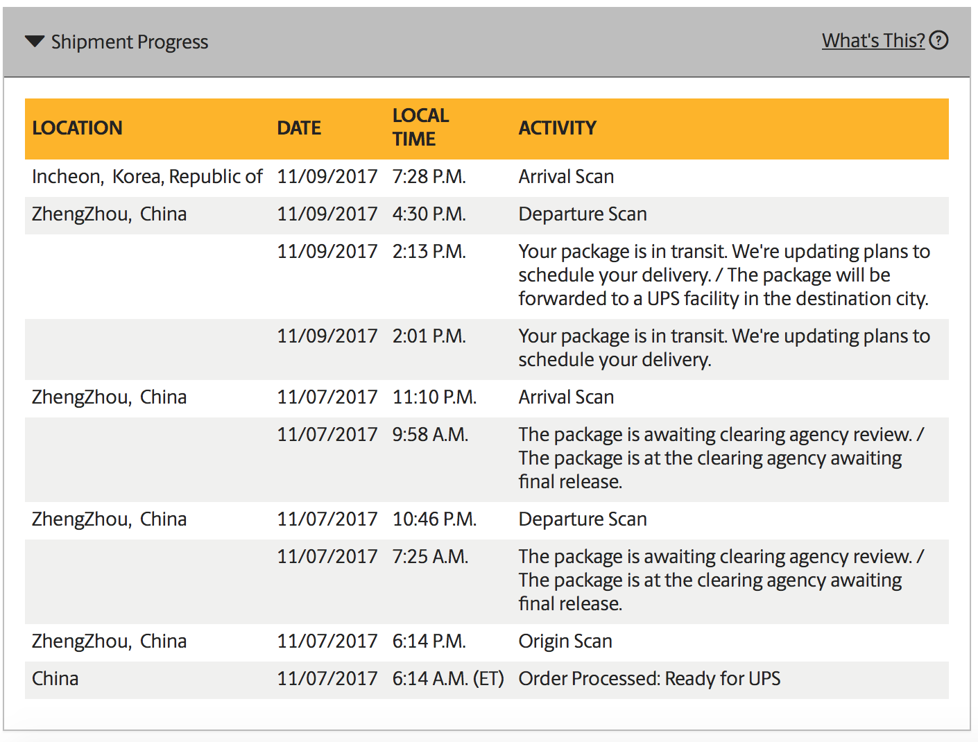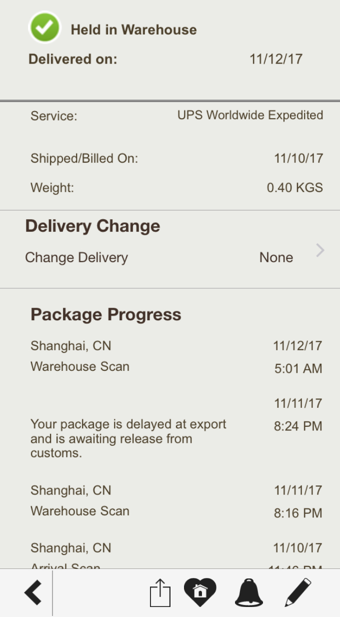 Did yours ever update to "Export Scan"? I never saw the delayed update but I am have been on Export scan for 8 or so hours now.Not expecting mine to move from Shanghai until Sunday morning, but UPS tracking is now calling it “delayed.”
