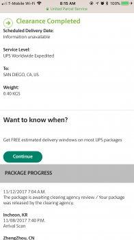 Still sitting in Incheon after having arrived there on Wednesday. UPS delivery still saying tomorrow.