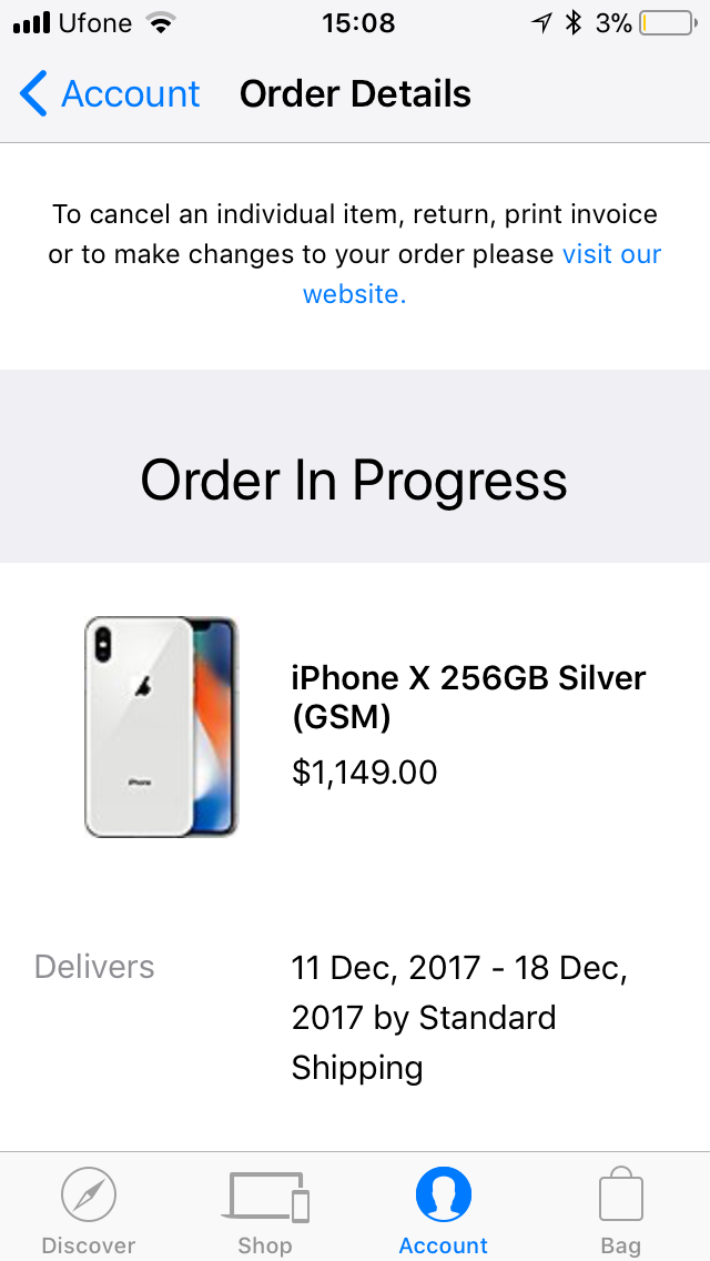 I have ordered an iPhone X, 256 GB, Silver online on 11/09 and getting the estimated delivery date within 12/11- 12/18 by standard shipping. As I am living in Pakistan, I am getting my phone delivered to my cousin's place who lives in Ohio & is visiting me on 12/14, he will probably leave his house for the airport on 12/12.