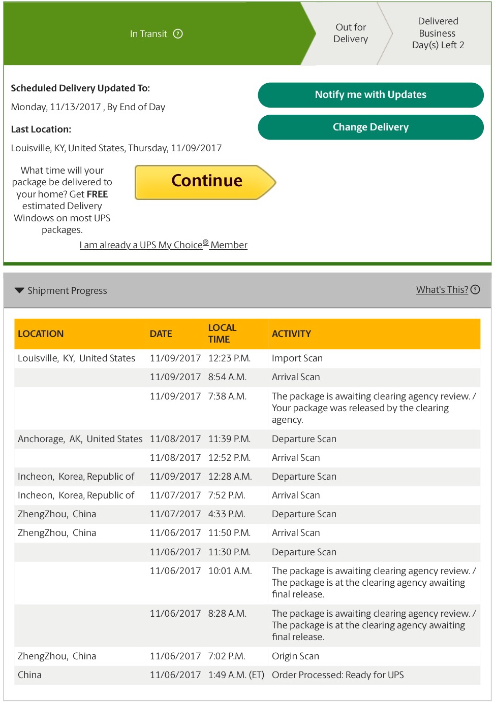 Did you end up receiving it on the 10th or the 13th? I'm in the same situation with this weekend.. Thanks!So order’s gotten this far as of right now. Any chance of it still being delivered by tomorrow (I live in the D.C. area) with overnight-ing it or is UPS probably just going to shoot for next Monday? I originally had a delivery date of the 10th but, like a lot of others, saw my delivery date get pushed back a few days after a delay in Incheon. Anyone know how long it generally takes after reaching Louisville?View attachment 734055