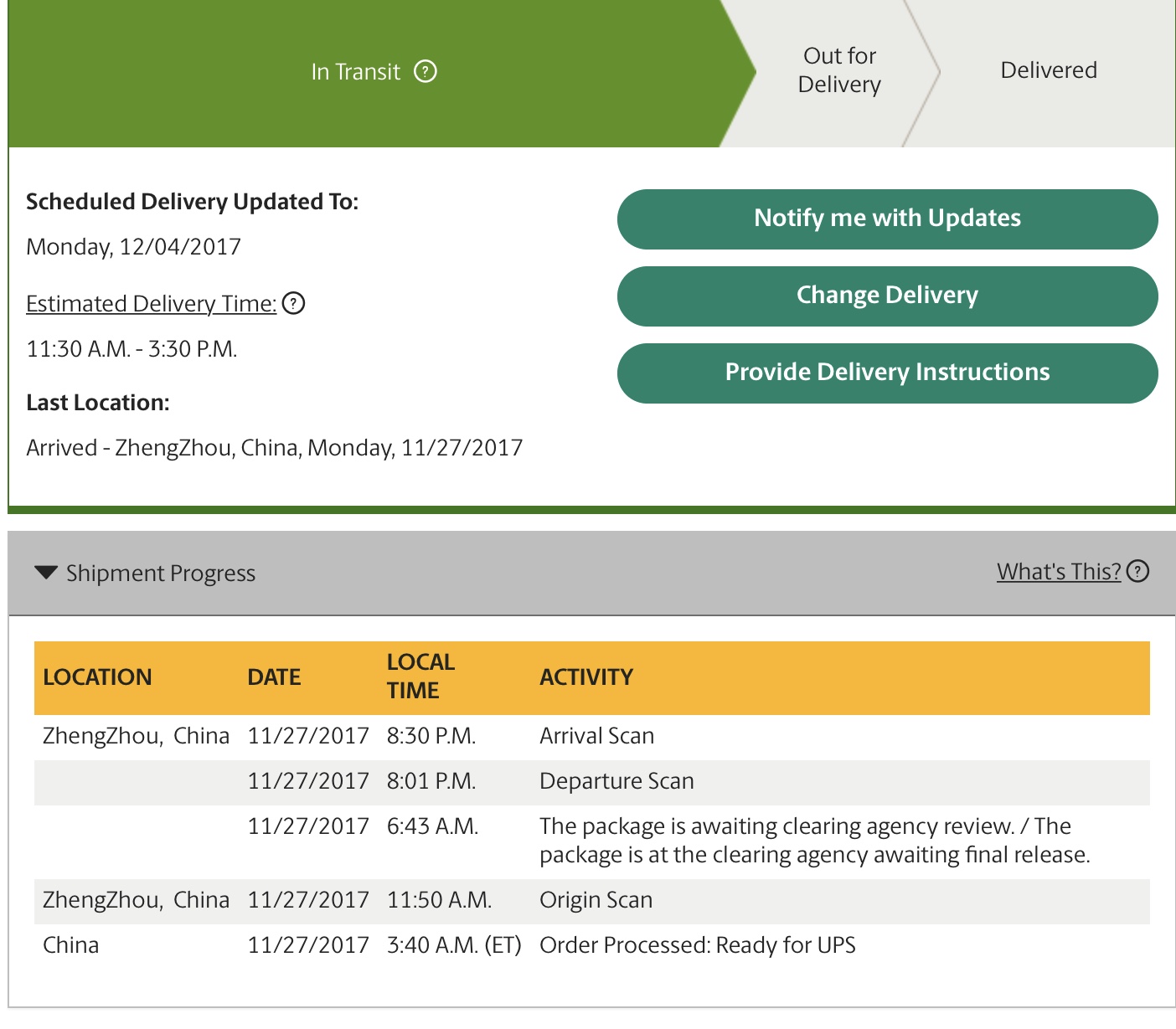 Is that later than UPS’s delivery date from a day or two ago? That happened to a lot of us. Mine said 11/15 for quite a while in the UPS My Choice app. Then on Monday the 13th it changed to new date 11/17.. Was bummed. But then I saw it leave ZhengZhou that night and by the end of the 14th the delivery date had changed back to 11/15.