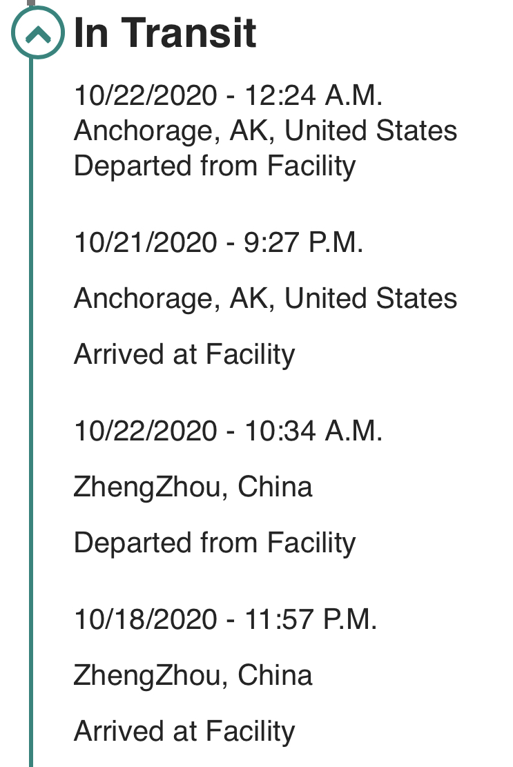 What was the date/time of the departure scan from Zhengzhou?Any idea when mine will make it SDF? It’s showing mine left ANC at 8pm, but did not see any flights leaving at that time.