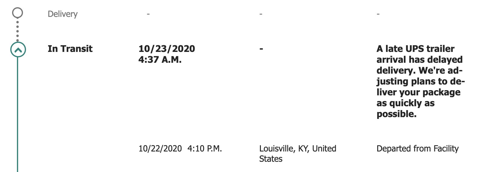 A late UPS trailer arrival has delayed delivery. We're adjusting plans to deliver your package as quickly as possible.