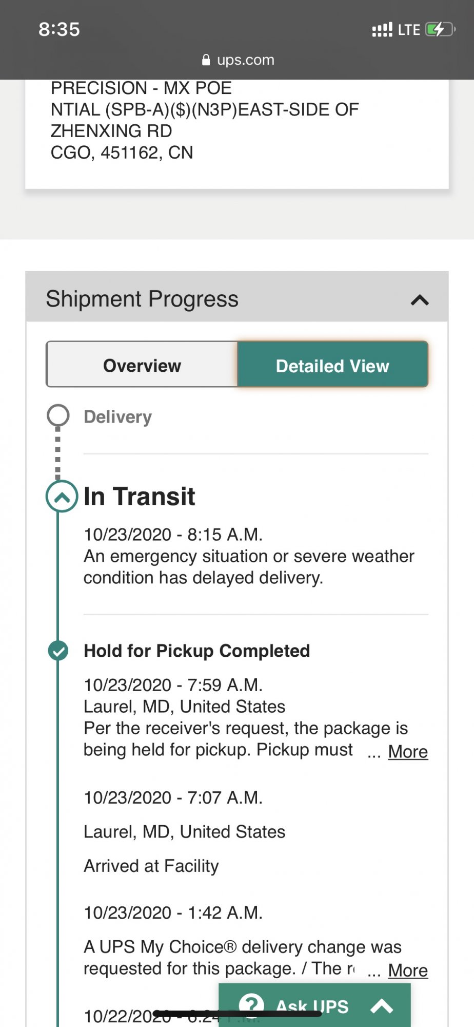 UPS sent mine to a different CC than I requested 10 miles away. I didn’t find out til I tried to pick up at the one I requested. Once I got to the CC where it was, there was a “bathroom break” sign at the counter - I sat there for 20 mins with no one in sight. At least they had it and didn’t send me on a wild goose chase.