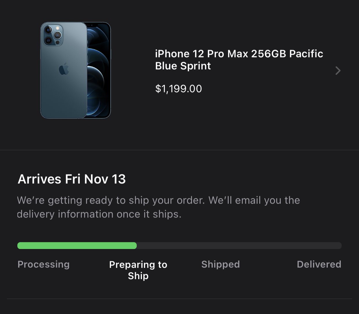 My iPhone too!Ordered the gold 12 Pro Max 256 GB right at 8:00AM EST. Can’t wait for next Friday! 😁