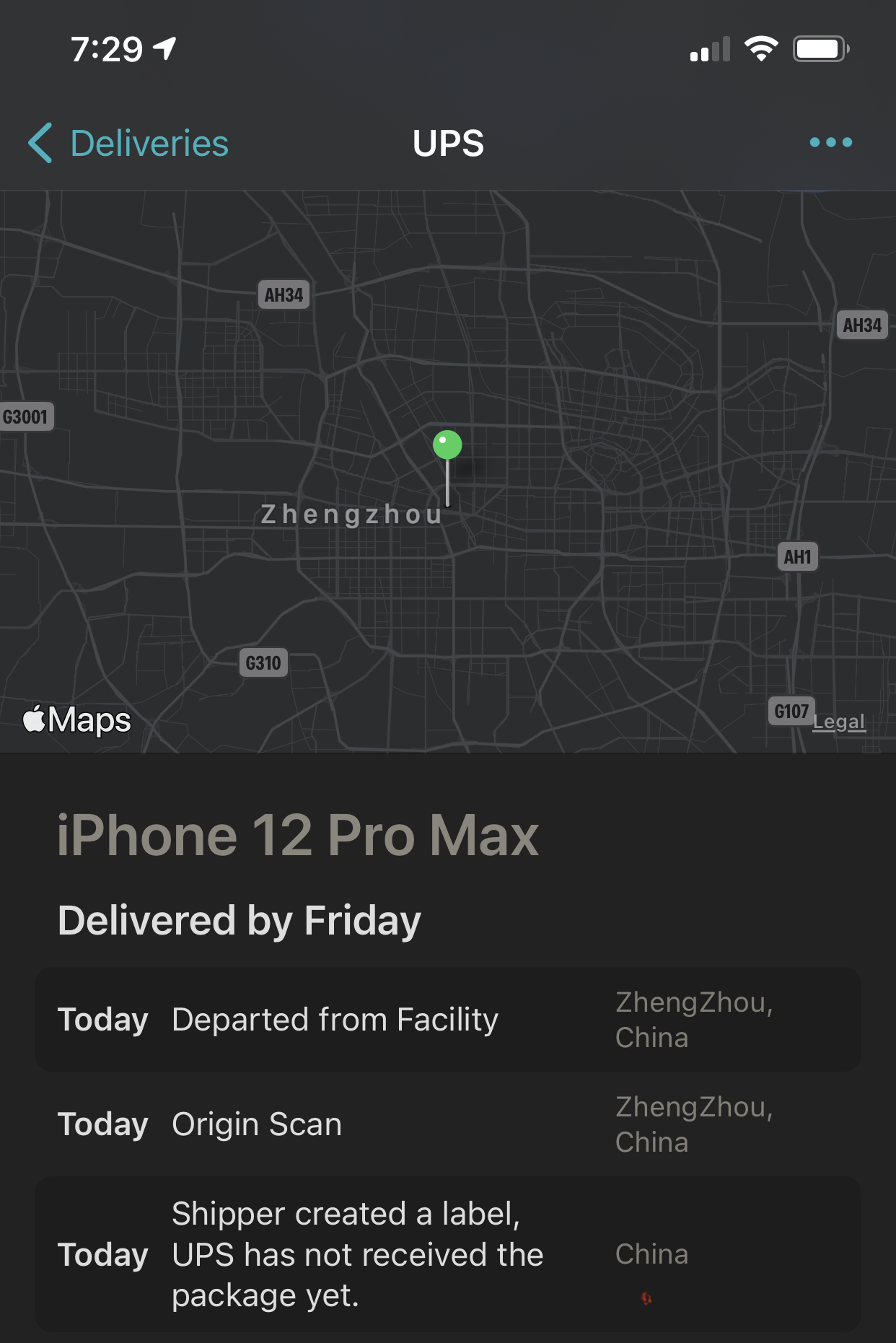 I have a 12 Pro Max (ATT) Gold 256 that departed at 6:06 pm in ZhengZhou and then shows an arrived at the same facility at 8 pm same date (both on 11/7)....no movement since yesterday.