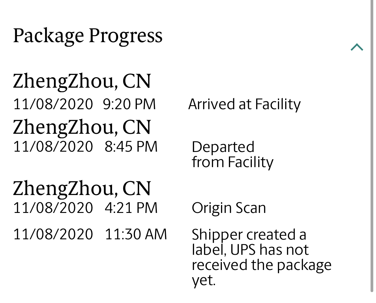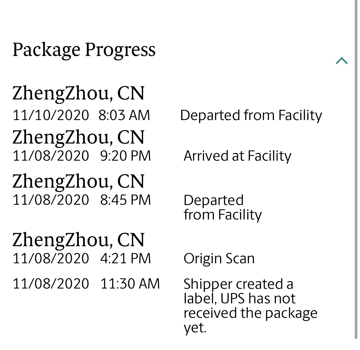 Zhengzhou 8:03am 11/10 Departed from Facility.