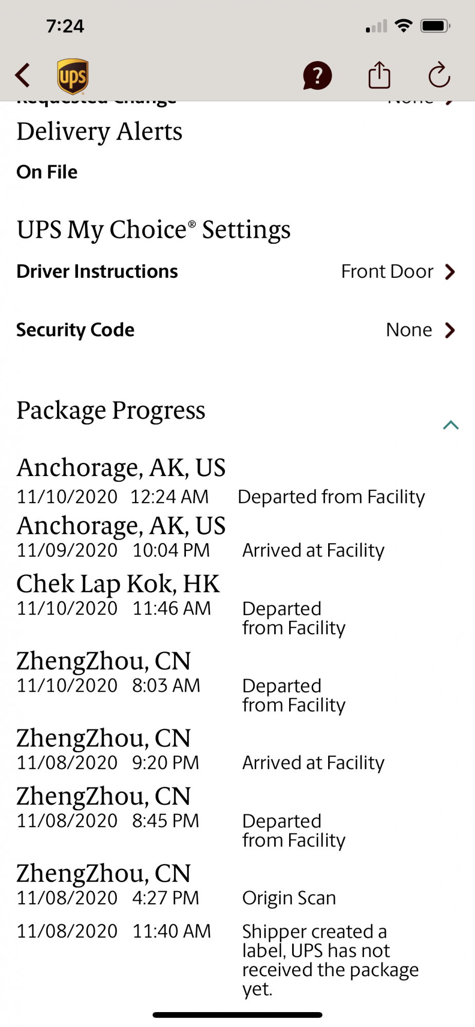 Just got up and saw the same (below) very strange as well looking at the flight of UPS 91 which came to Anchorage from IZUMISANO, JAPAN, and it got to Japan from Shanghai not Hong Kong I guess the scans are indeed missing some details, well what ever now some 3 hours out of Kentucky and the UPS hub.Yea I saw that on my tracking, why Hong Kong? maybe some drop offs maybe? Either way it left anchorage, on its way to KY.